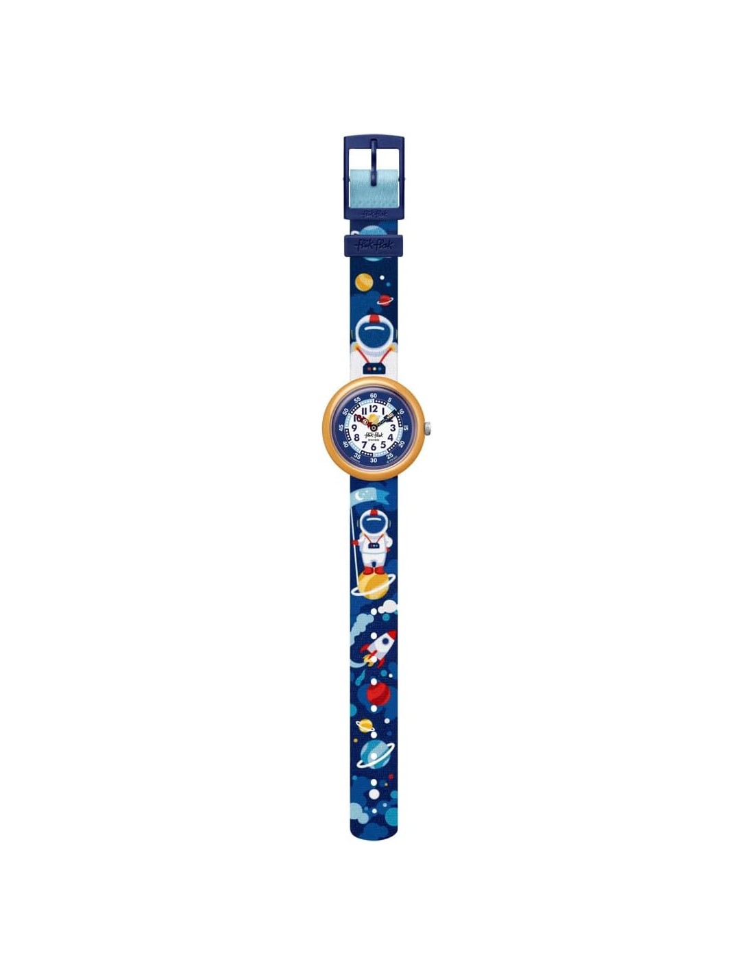 Sumérgete en la diversión galáctica con nuestro reloj infantil educativo en azul y amarillo; un regalo con planetas, cohetes y astronautas.