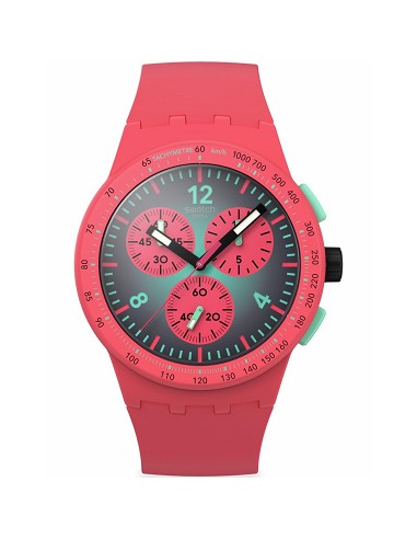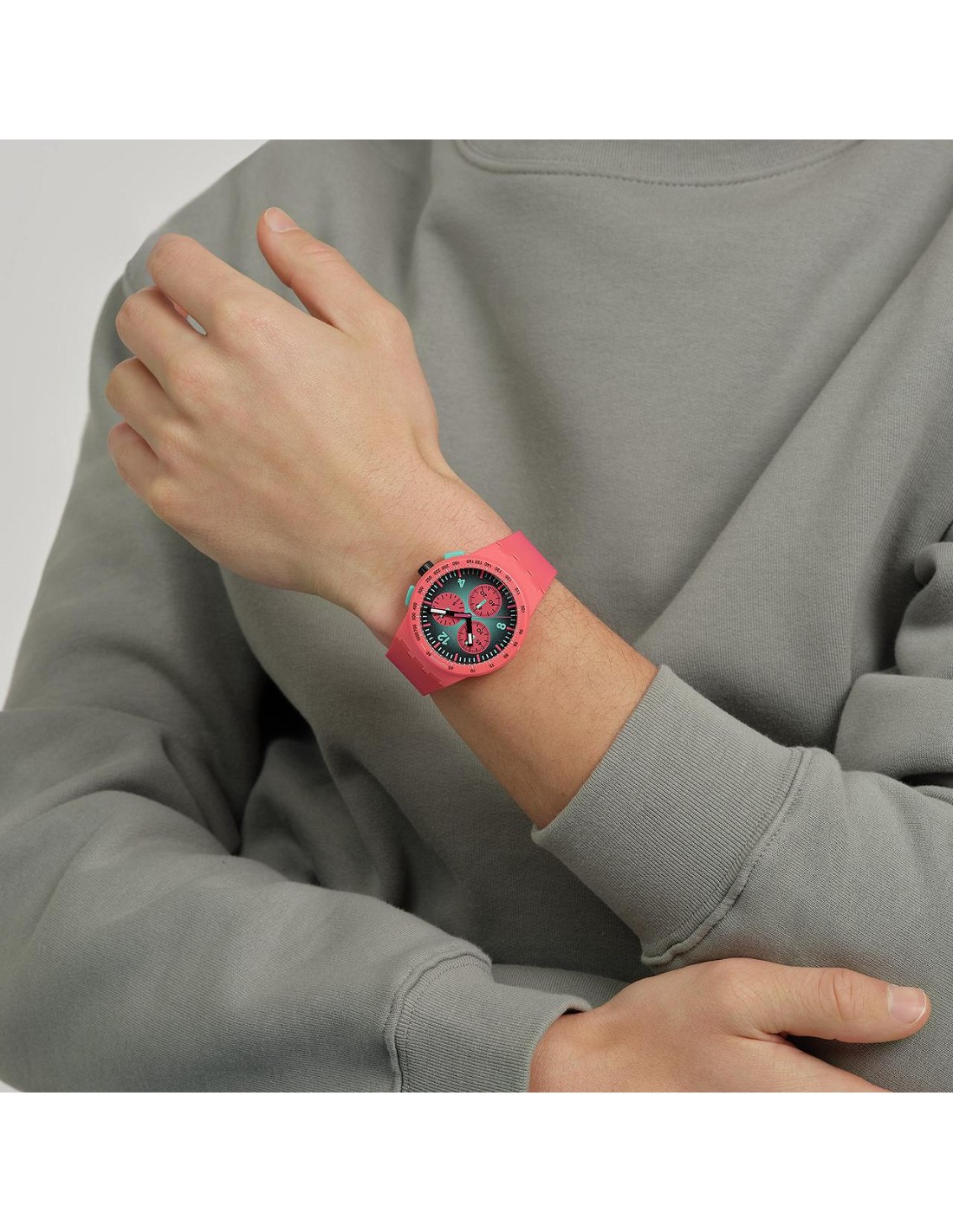Este cronógrafo tiene una esfera de color turquesa y verde oscuro con un efecto degradado y un estampado multicolor, aguja horaria y minutero negros que brillan en la oscuridad y segundero rosa oscuro. La caja rosa oscuro mate tiene un bisel a juego con una escala taquimétrica impresa en negro y turquesa, pulsadores de color turquesa mate y una corona negra. Una correa de color rosa oscuro y turquesa mate con un efecto degradado y una trabilla y una hebilla rosa oscuro mate completan el reloj.
