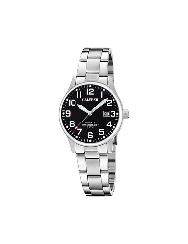 Reloj Calypso para mujer de la colección Basic fabricado en acero inoxidable plateado. Este atractivo reloj cuenta con caja de 32mm de diámetro con bisel plateado que contiene esfera azul con números en color negro al igual que sus agujas movidas por mecanismo de cuarzo analógico con función de calendario. Todo ello protegido por cristal mineral. Su brazalete lo forman eslabones plateados con cierre desplegable mediante doble pulsador. Resistente al agua hasta 5 ATM.