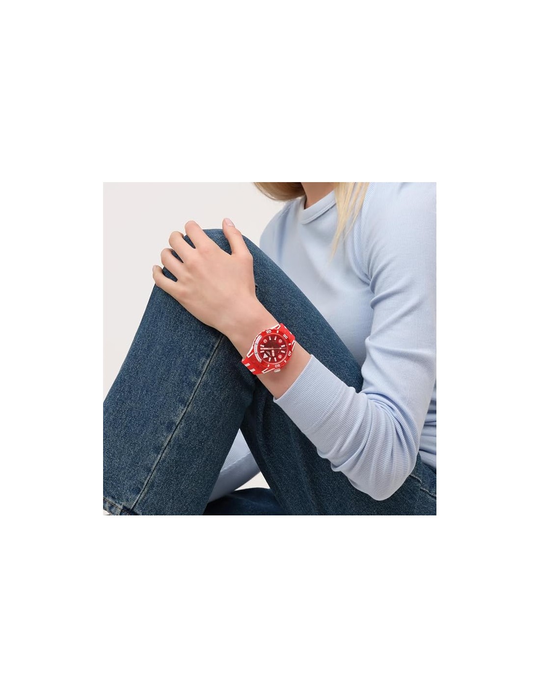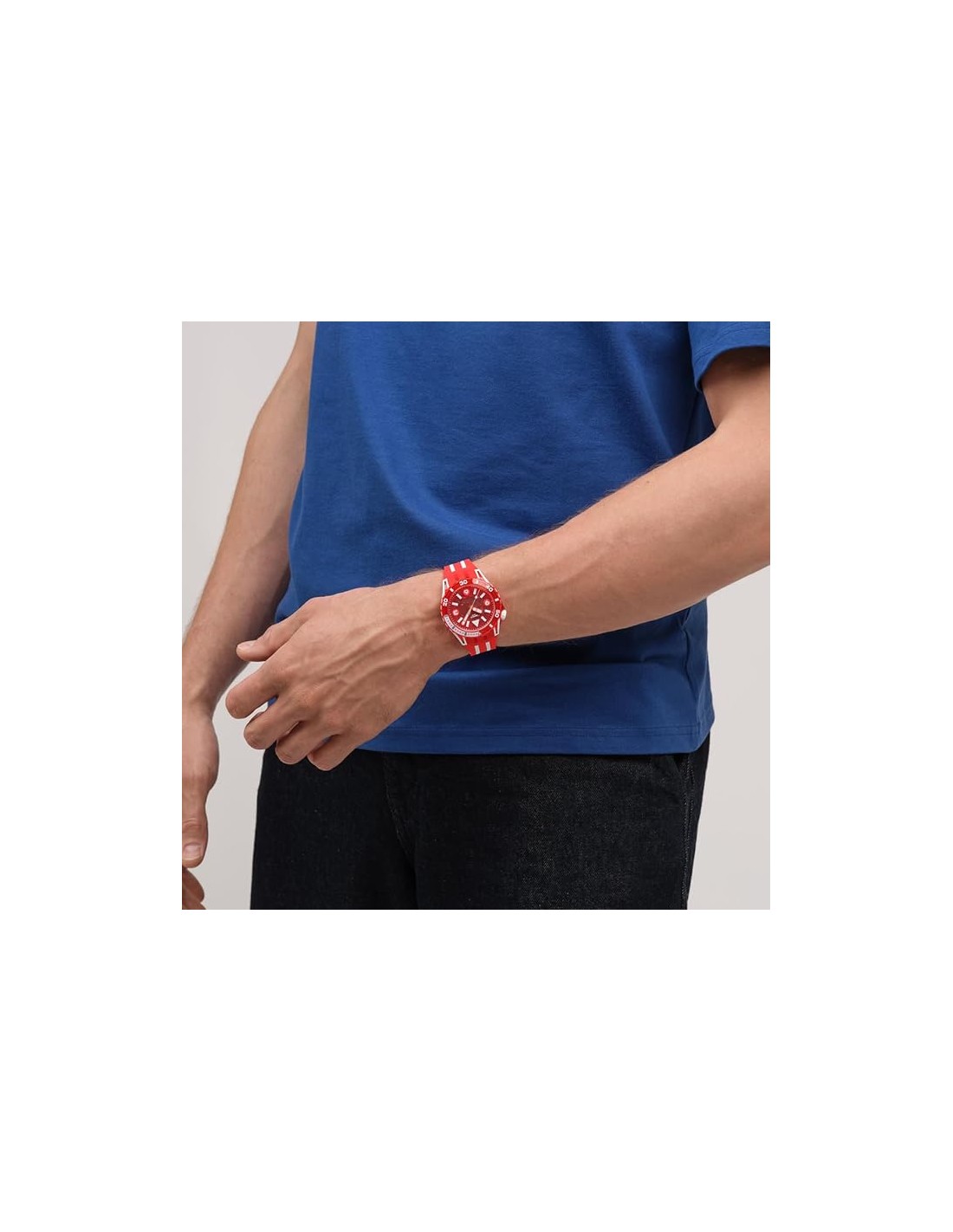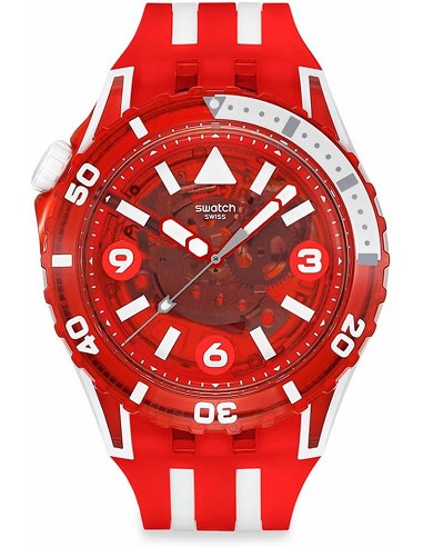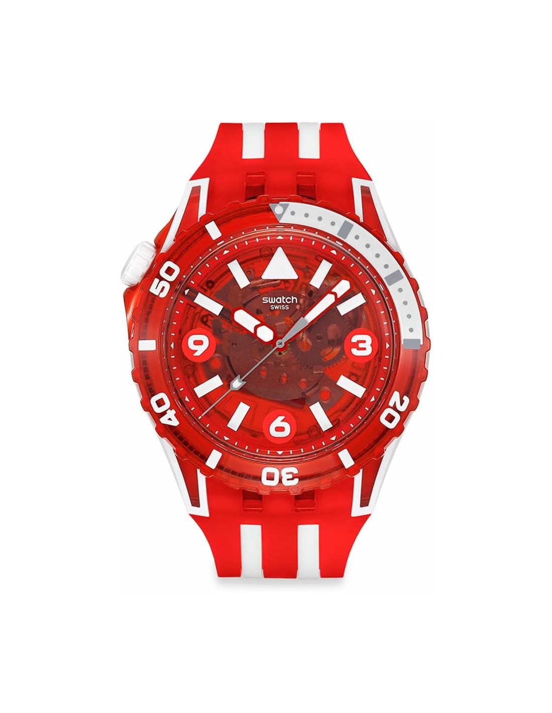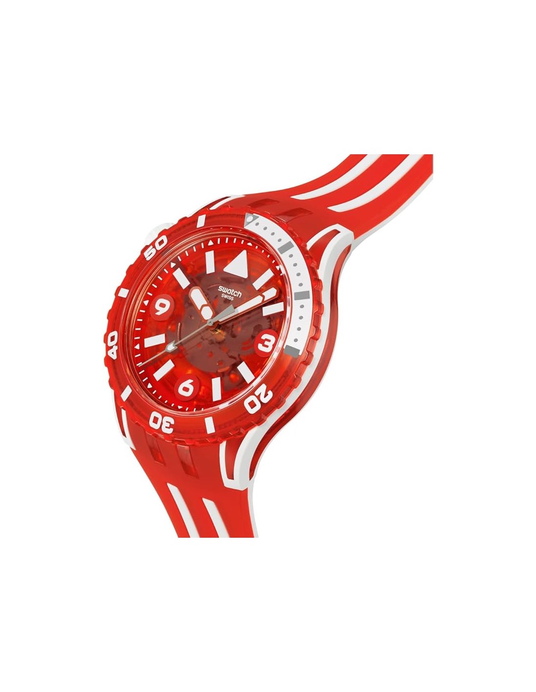 La esfera de este reloj de submarinismo es de color rojo transparente. Los índices y los números están impresos en blanco, la aguja horaria y el minutero son rojos y el segundero es gris. Todos estos elementos se sitúan bajo un cristal de origen biológico y brillan en la oscuridad. La caja combina Bioceramic blanco mate con material de origen biológico de color rojo transparente brillante. El bisel de origen biológico es de color rojo transparente brillante y tiene un estampado gris y blanco que brilla en la oscuridad y una corona de Bioceramic blanca mate situada a las 10 h. Por último, tiene una correa a rayas blancas mate y rojas transparente mate con una trabilla roja transparente mate y una hebilla de origen biológico roja transparente brillante.