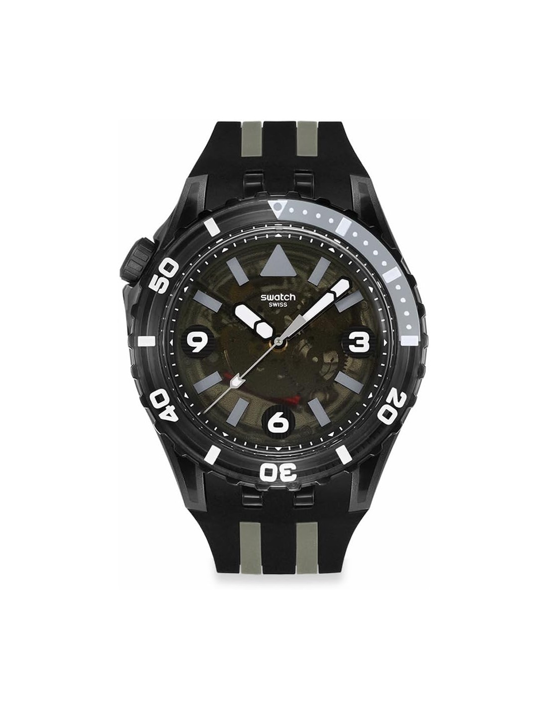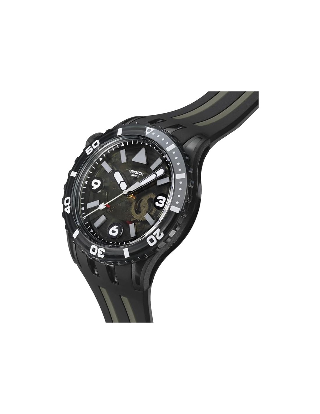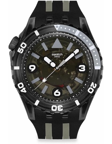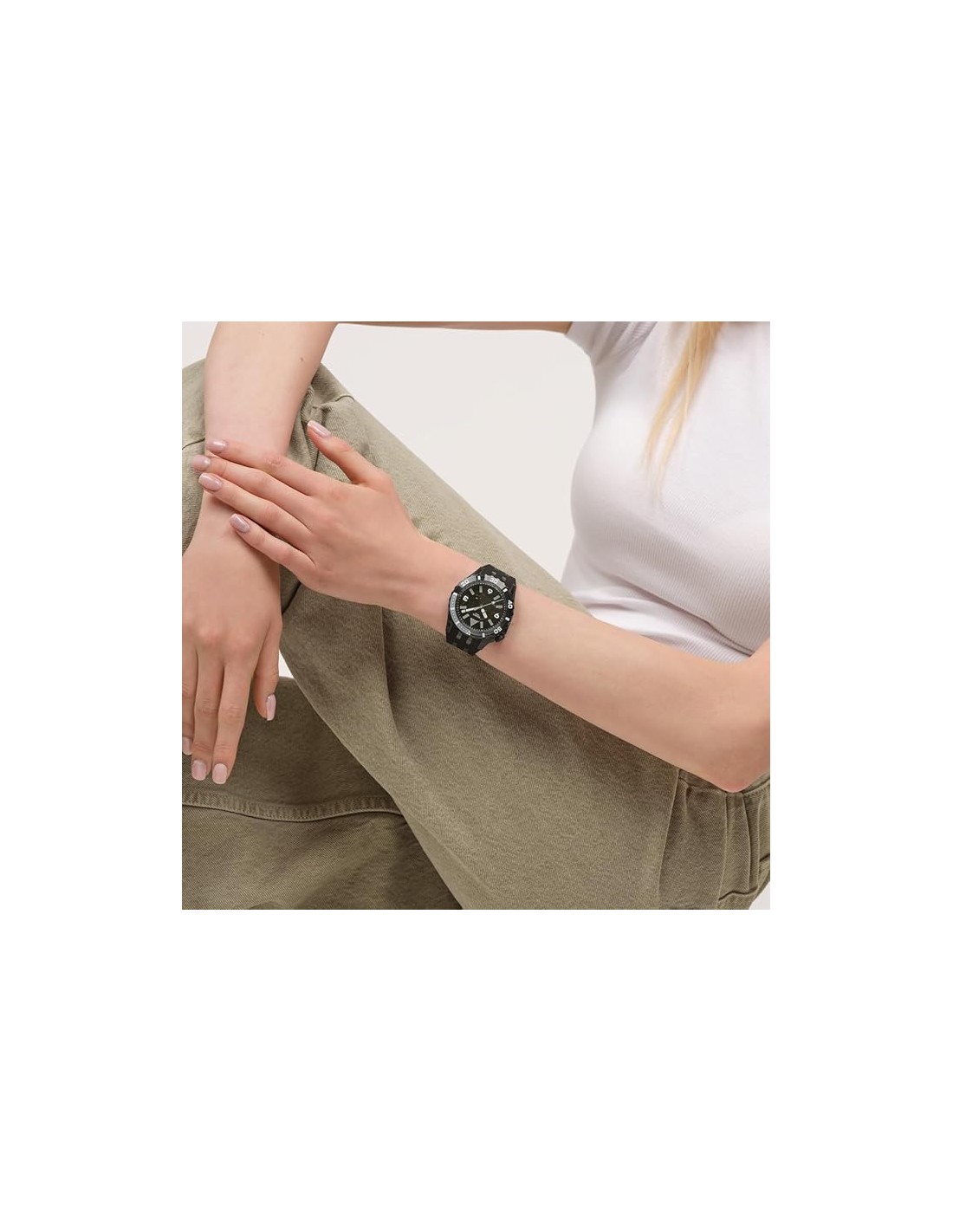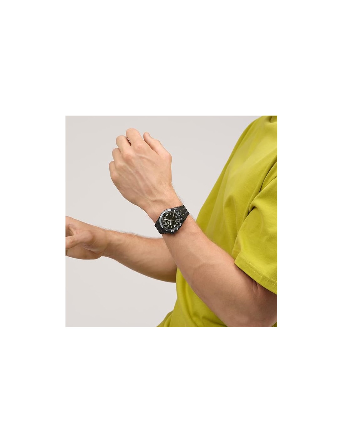 La esfera de este reloj de submarinismo es de color negro transparente. Los índices están impresos en color gris, los números en blanco, la aguja horaria y el minutero son negros y el segundero también es de color gris. Todos estos elementos se sitúan bajo un cristal de origen biológico y brillan en la oscuridad. La caja combina Bioceramic negro mate con material de origen biológico de color negro transparente brillante. El bisel de origen biológico es de color negro transparente brillante y tiene un estampado gris y blanco que brilla en la oscuridad y una corona de Bioceramic negra mate situada a las 10 h. Por último, lleva una correa a rayas negras mate y negras transparente mate con una trabilla negra mate y una hebilla de origen biológico negra transparente brillante.