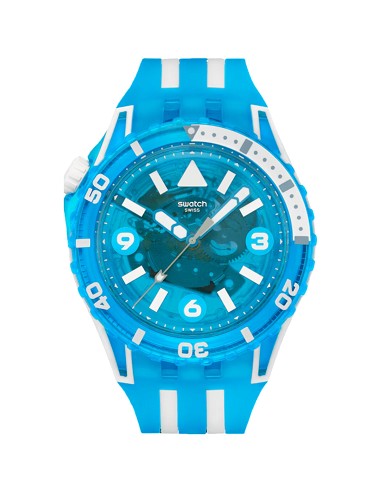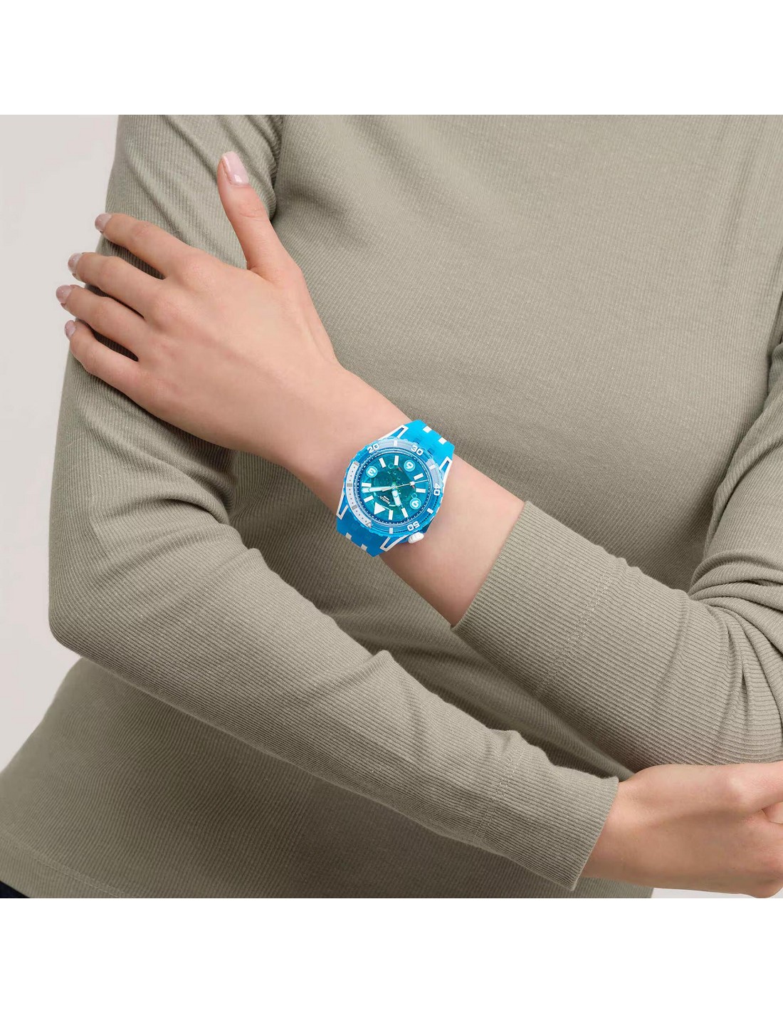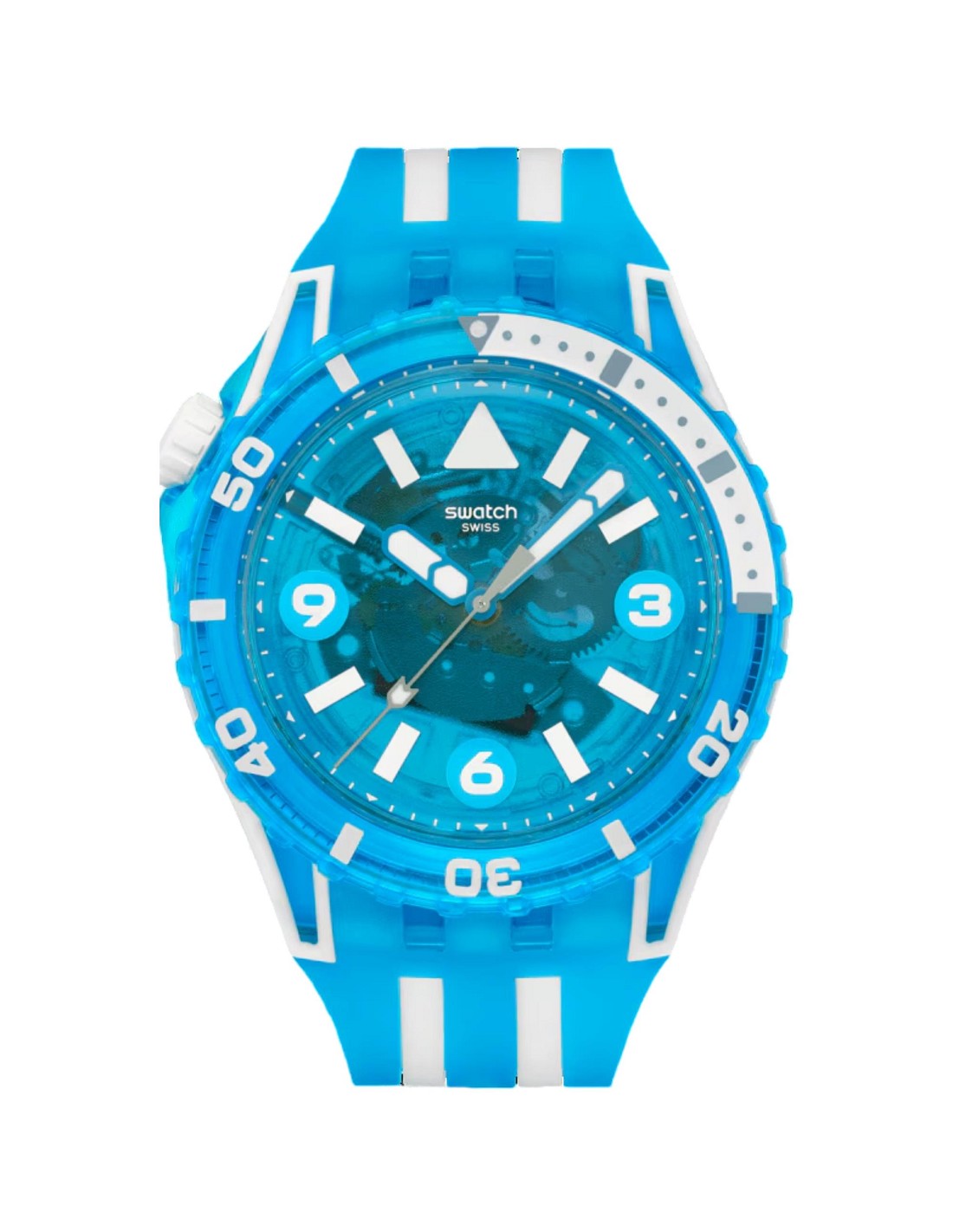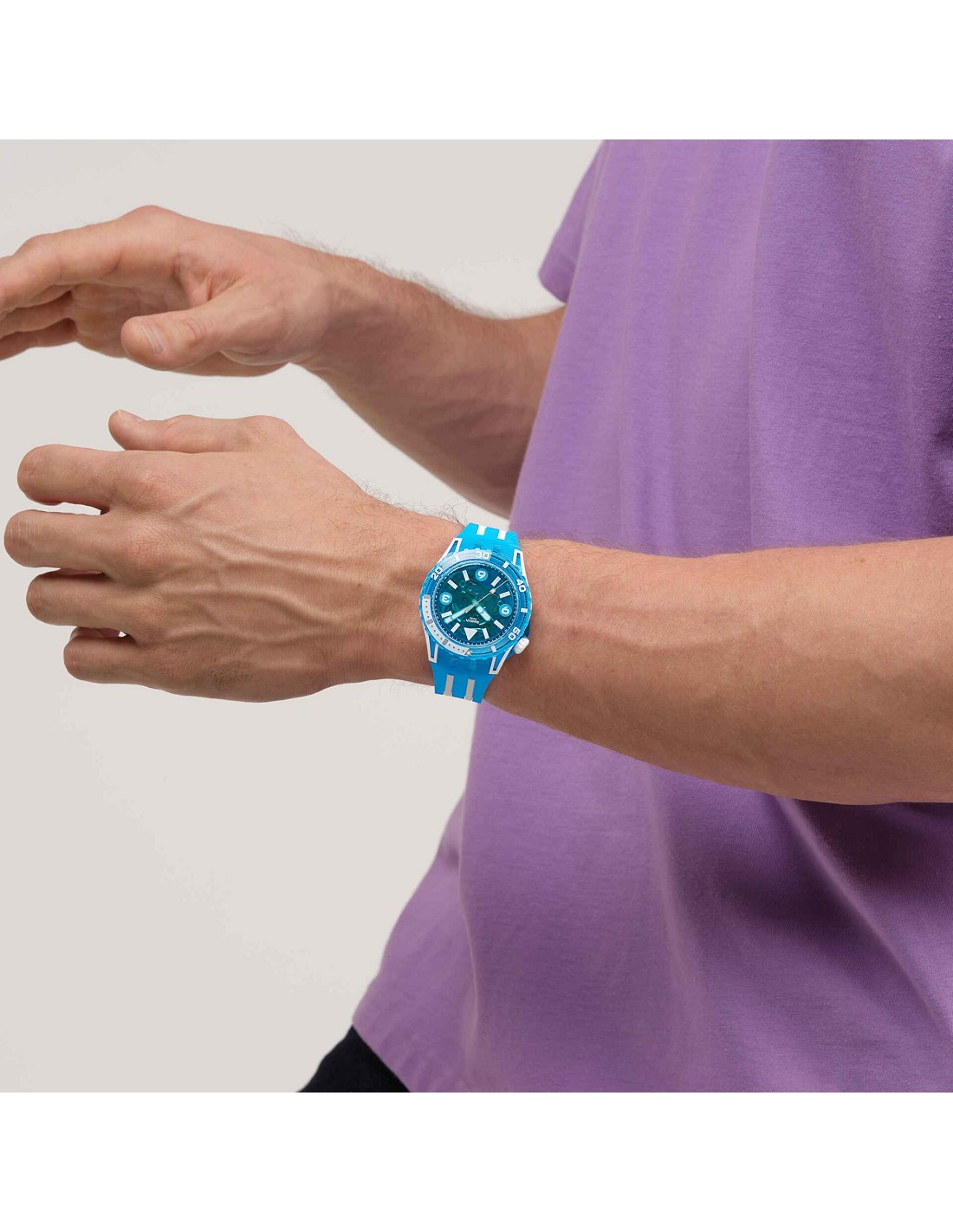 La esfera de este reloj de submarinismo es de color azul transparente. Los índices y los números están impresos en blanco, la aguja horaria y el minutero son azules y el segundero es gris. Todos estos elementos se sitúan bajo un cristal de origen biológico y brillan en la oscuridad. La caja combina Bioceramic blanco mate con material de origen biológico de color azul transparente brillante. El bisel de origen biológico es de color azul transparente brillante y tiene un estampado gris y blanco que brilla en la oscuridad y una corona de Bioceramic blanca mate situada a las 10 h. Por último, tiene una correa a rayas blancas mate y azules transparente mate con una trabilla azul transparente mate y una hebilla de origen biológico azul transparente brillante.