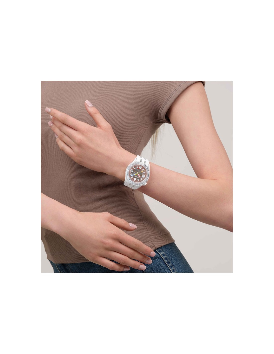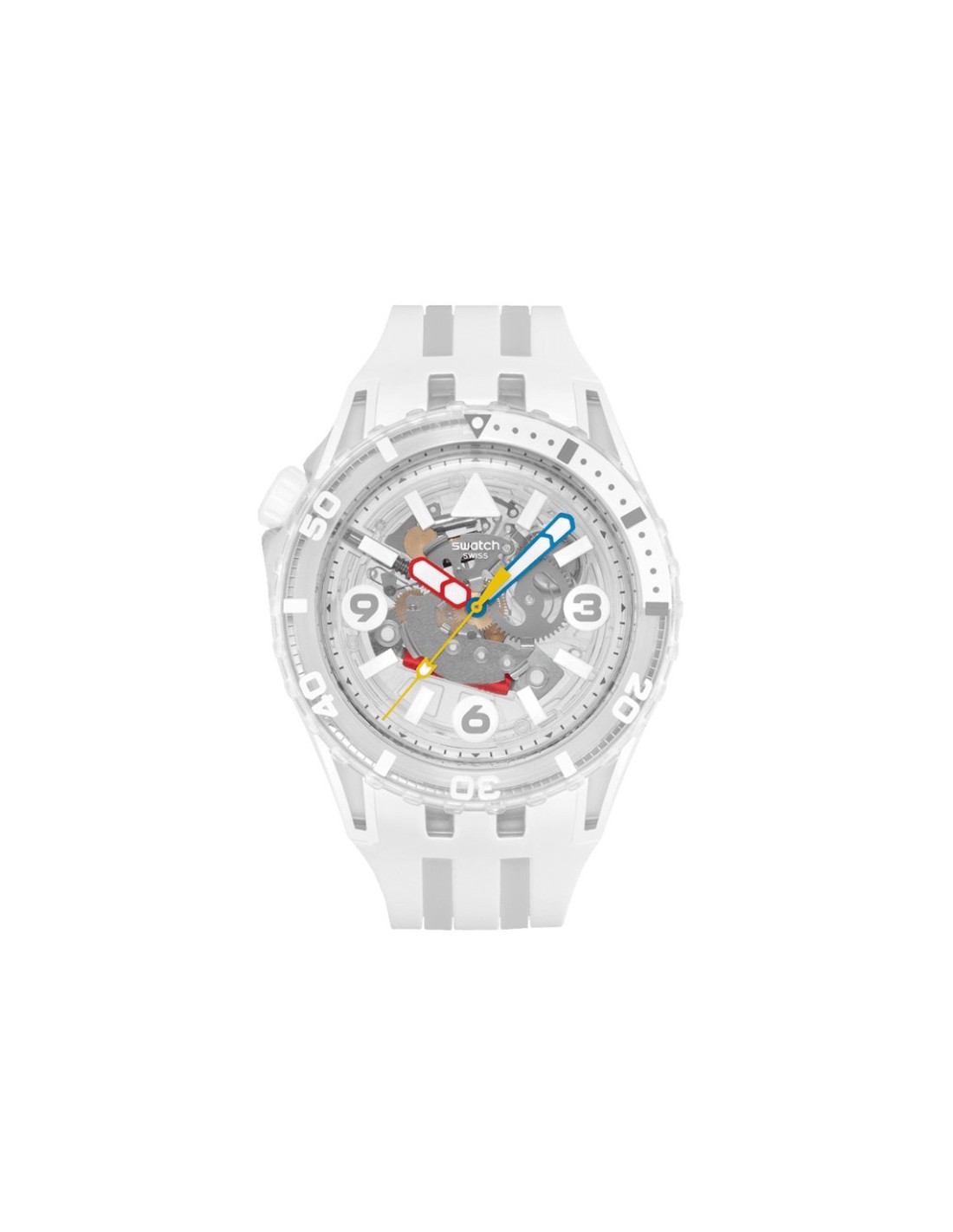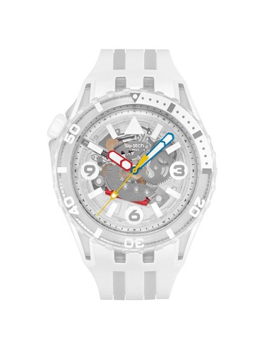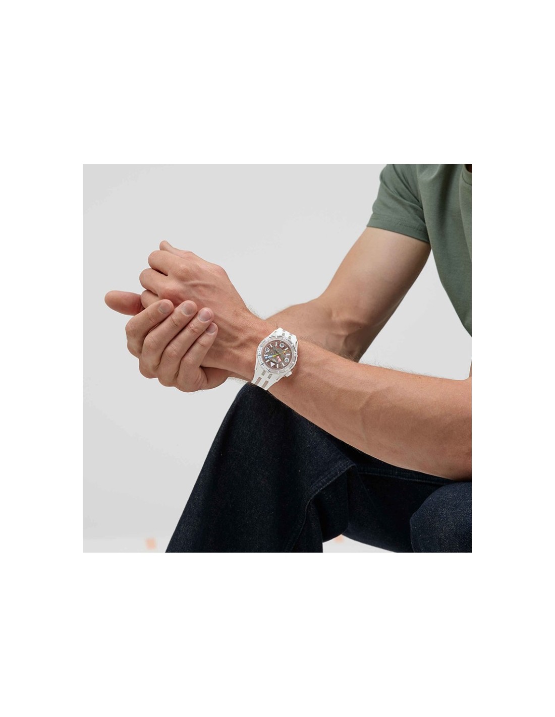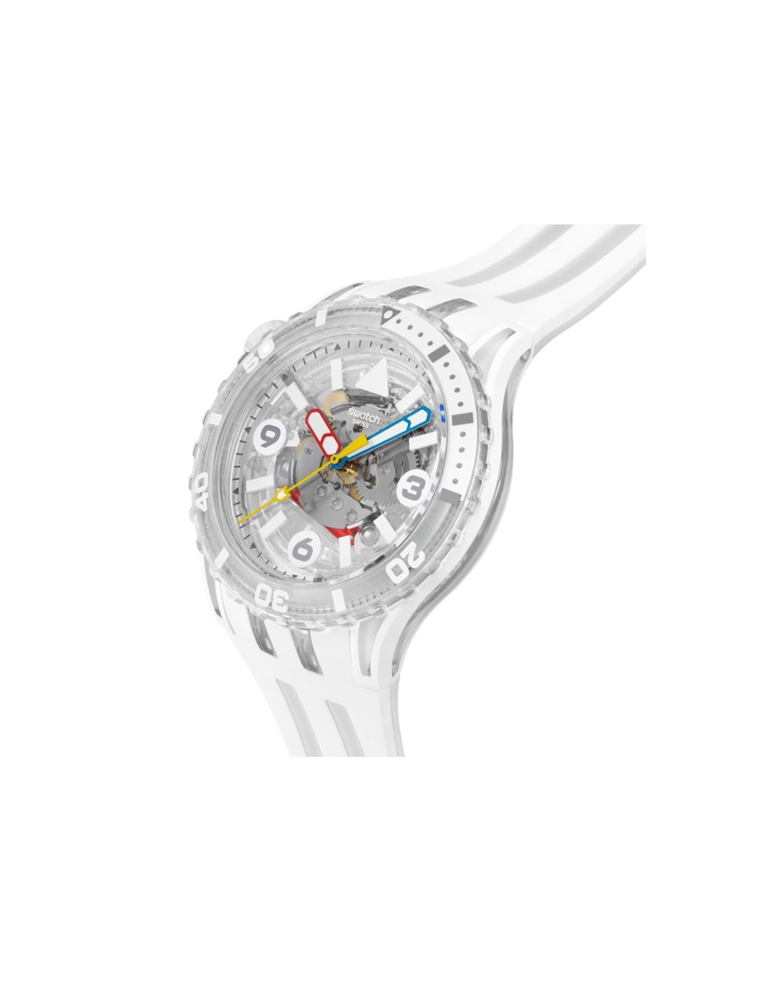 La esfera de este reloj de submarinismo es transparente. Los índices están impresos en blanco, los números en gris, la aguja horaria es roja, el minutero es azul y el segundero es amarillo. Todos estos elementos se sitúan bajo un cristal de origen biológico y brillan en la oscuridad. La caja combina Bioceramic blanco mate con material de origen biológico transparente brillante. El bisel de origen biológico es transparente brillante y tiene un estampado gris y blanco que brilla en la oscuridad y una corona de Bioceramic blanca mate situada a las 10 h. Por último, tiene una correa a rayas blancas mate y transparente mate con una trabilla blanca mate y una hebilla de origen biológico transparente brillante.