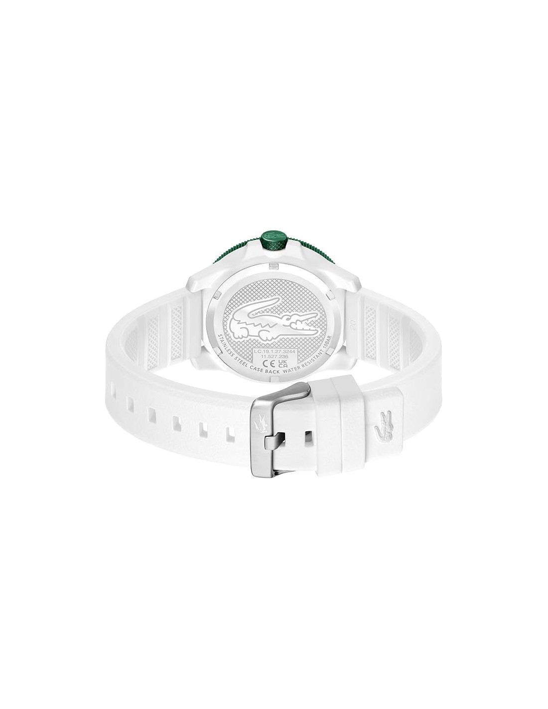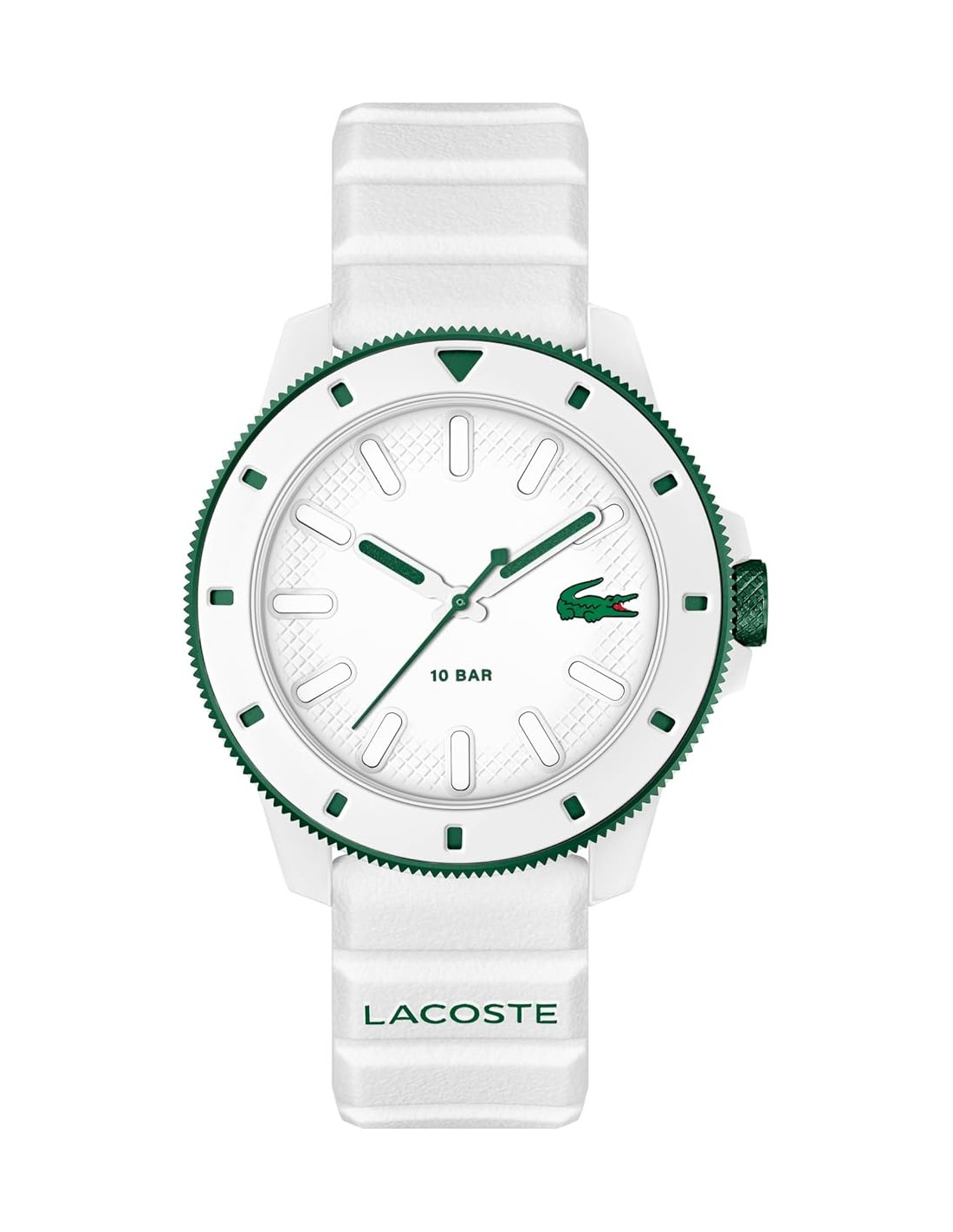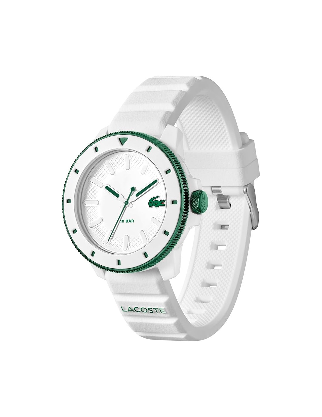 Reloj Lacoste de Hombre fabricado con correa de silicona en blanco y el nombre de la marca en color verde. Dispone de bisel y esfera en color blanco, tres agujas en color verde, marcadores en forma de barra y el logotipo de la marca en la posición del 3. Un modelo deportivo perfecto para combinar con looks diarios.