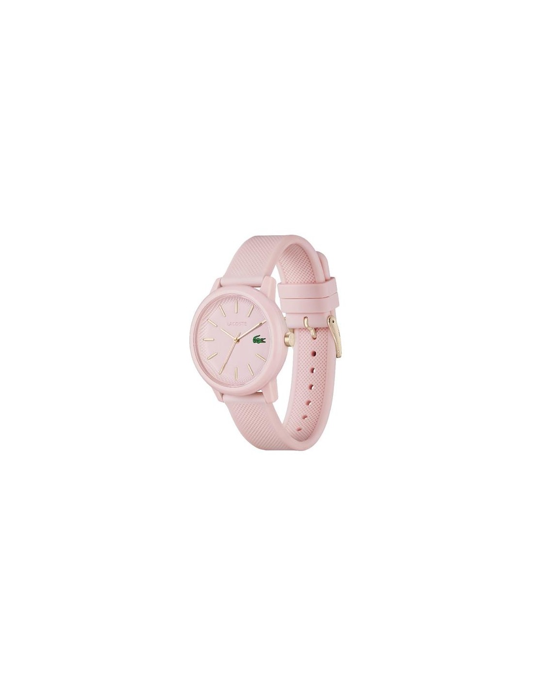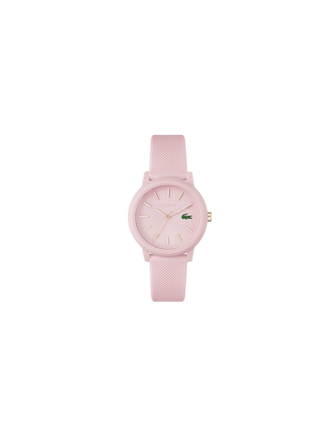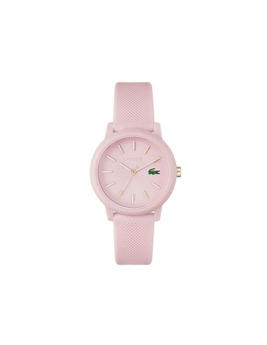 Reloj Lacoste para mujer de la colección Ladies fabricado en Tr90 y silicona en color rosa mate. Se trata de un diseño lleno de atractivo y originalidad compuesto por caja de 36mm de diámetro con esfera rosa que contiene índices y agujas en color champán movidas por mecanismo de cuarzo analógico protegido por cristal mineral. Su correa es de silicona en color rosa con detalle de Petit Piqué con cierre de hebilla. Resistente al agua hasta 50 metros.