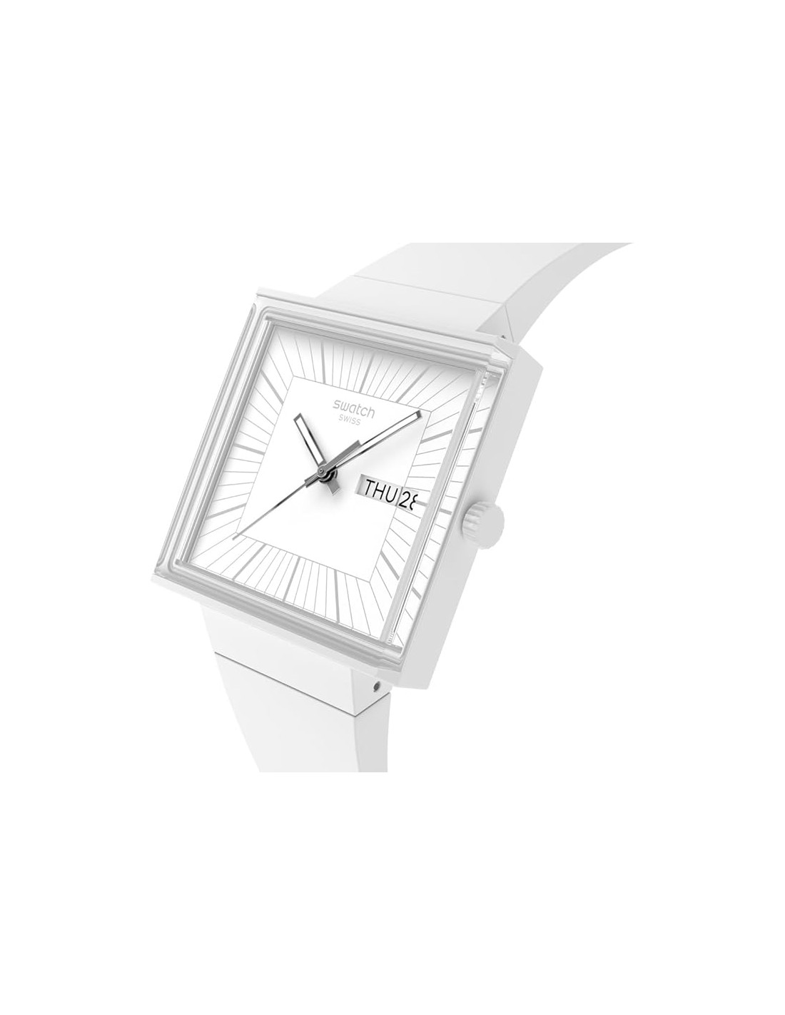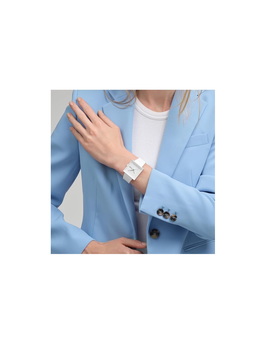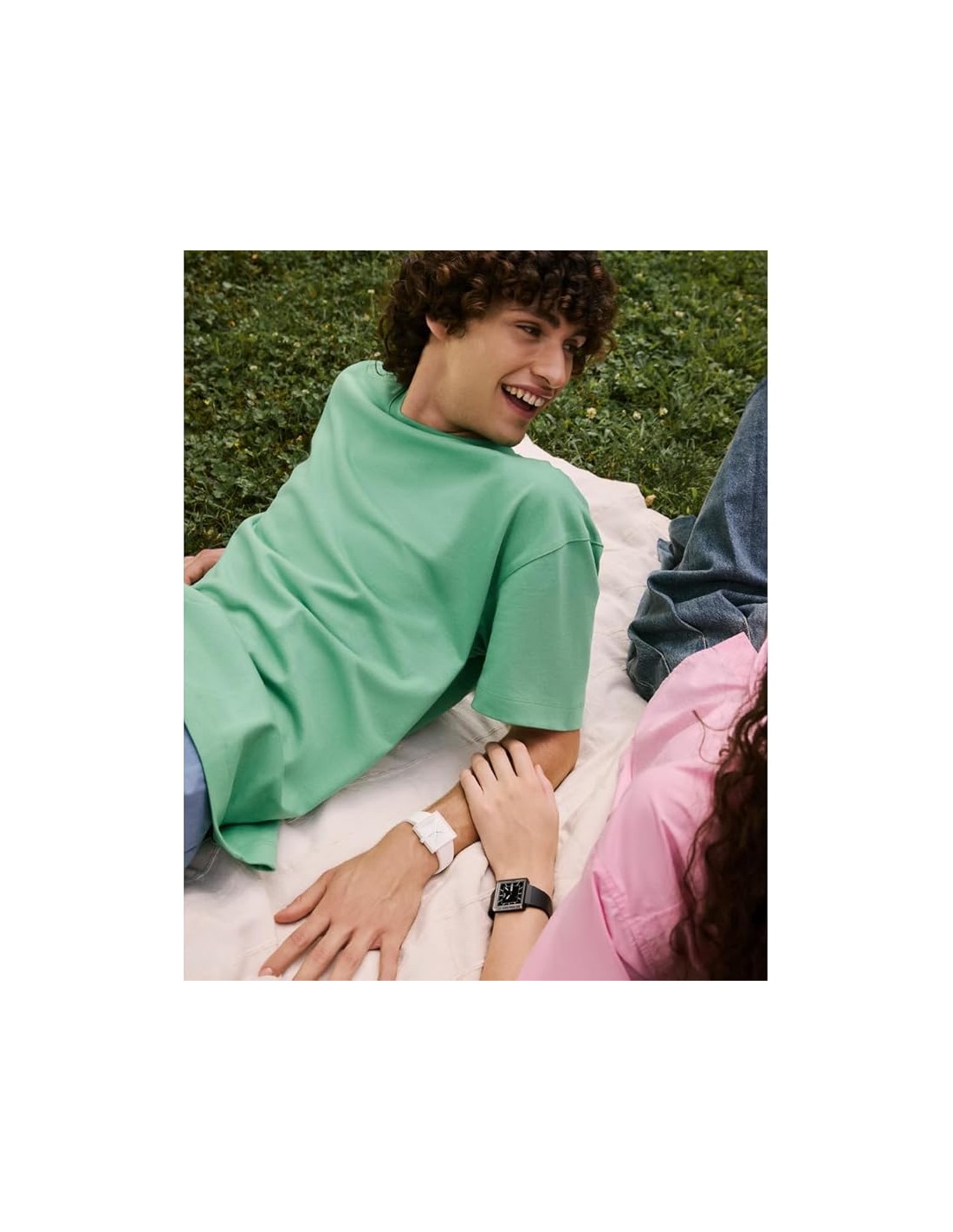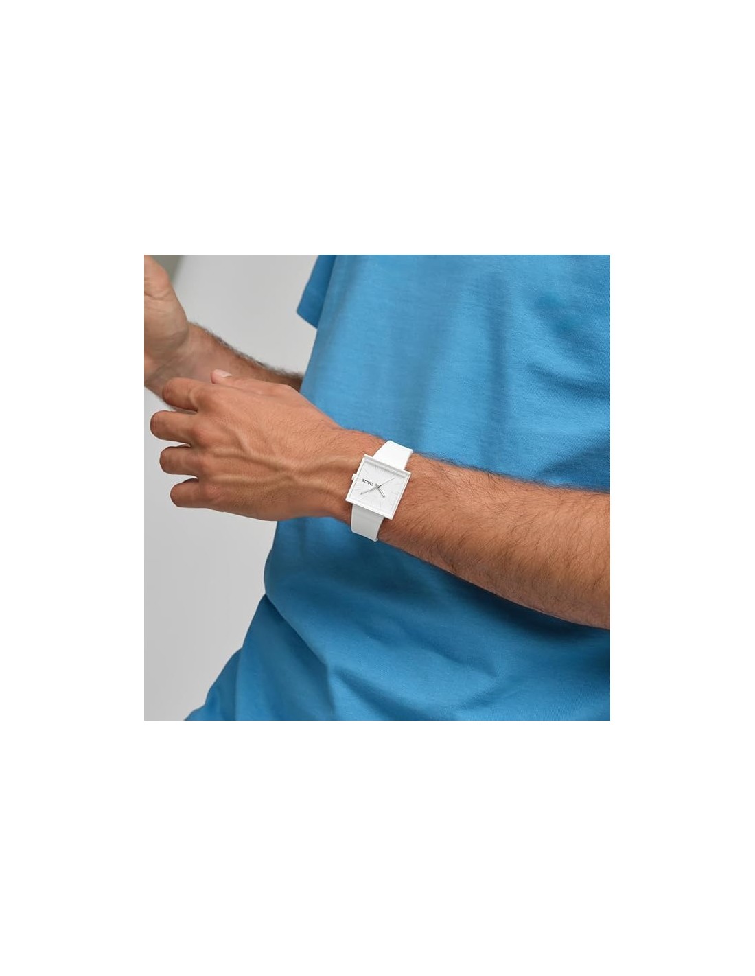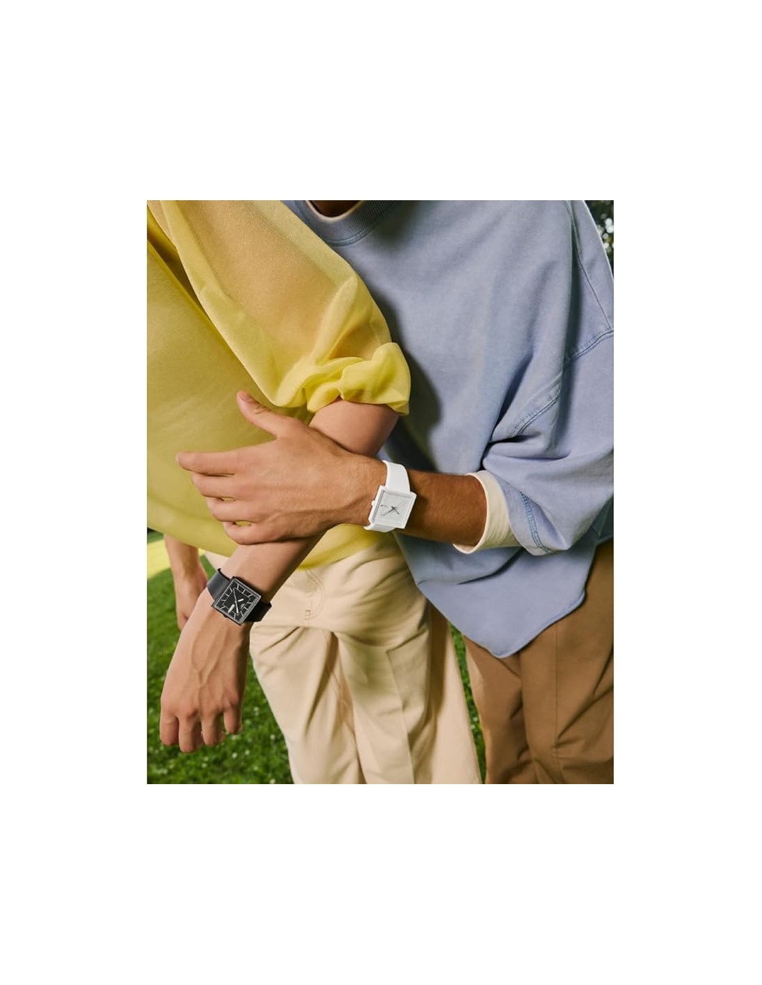 La caja cuadrada mate blanca en BIOCERAMIC de este reloj cuenta con un cristal de origen biológico de borde a borde que ofrece una vista lateral de los índices y de los marcadores de minutos impresos en gris. La esfera blanca cuadrada tiene la aguja horaria y el minutero plateados y brillan en la oscuridad, un segundero plateado y una ventana que indica la fecha y el día a las 3 horas. La esfera se complementa con una correa blanca mate integrada con trabilla y hebilla a juego. La tapa de la pila en la parte posterior está lleva impresa la vista frontal del reloj.