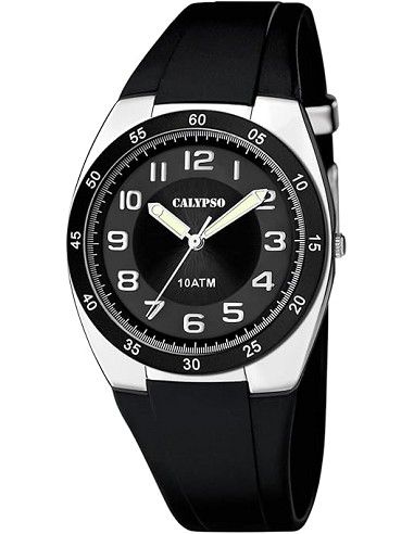 Reloj Calypso Street Style para hombre fabricado en acero inoxidable y caucho con mecanismo analógico. Estamos ante un reloj de estilo elegante y atemporal fabricado con caja de acero inoxidable en color plateado de 39,75 mm de diámetro con esfera negra y diales blancos con agujas plateadas movidas por mecanismo de cuarzo analógico protegido por cristal mineral. Su correa es de caucho en color negro con cierre de hebilla. Resistente al agua hasta 100 metros.
